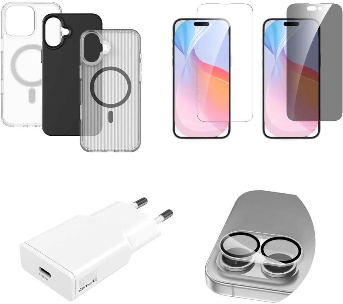 Alles, was dein iPhone 16 braucht:Erlebe das ultimative Rundum-Sorglos-Paket für dein iPhone 16. Das 7-in-1-Set beinhaltet zwei Schutzgläser für den Bildschirm, einen praktischen Montagerahmen zur einfachen Anbringung, drei unterschiedliche Schutzhüllen für jede Gelegenheit, ein robustes Kameraglas und ein leistungsstarkes 20W-Netzteil. Mit diesem Set bist du bestens ausgerüstet, um dein iPhone 16 rundum zu schützen und zu pflegen.
