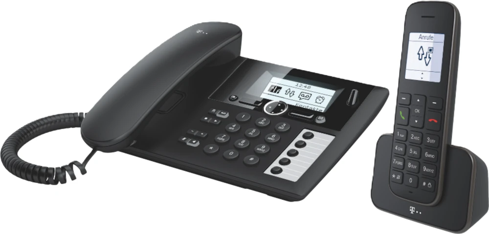 Schnurloses DECT-Telefon-Kombination mit integriertem Anrufbeantworter (20 Min. Aufzeichnung) im Einstiegsbereich, bestehend aus einer schnurgebundenen Basisstation und einem Mobilteil mit Ladeschale, geeignet für den Standardanschluss.